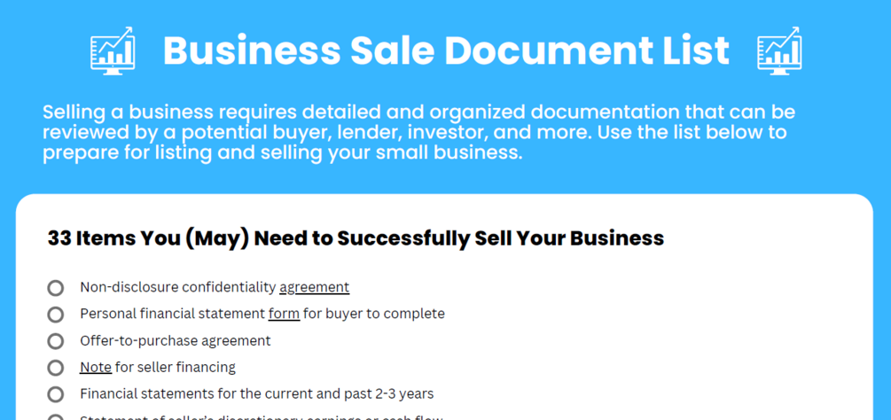 Selling a business requires detailed and organized documentation that can be reviewed by a potential buyer, lender, investor, and more. Use this list to prepare for listing and selling your business on your own - no brokers needed. Pay what you'd like!